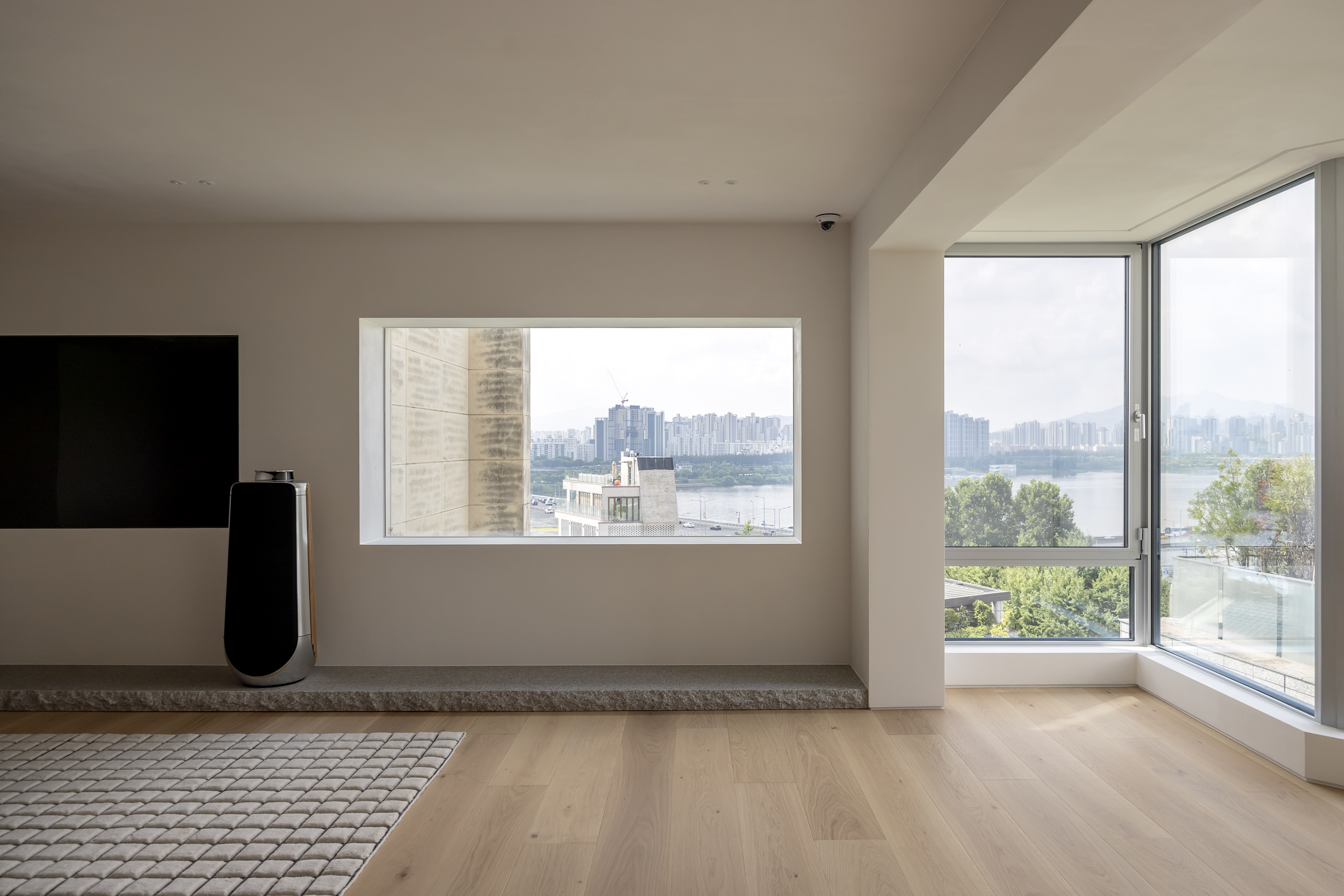 한남동 유엔빌리지 안에 위치한 이 프로젝트는 오래된 주택이었으나 넓은 거실 면적과 한강이 내려다보이는 장점을 가진 공간이었습니다. 이에 프레임이 얇은 시스템 창호를 시공하여, 내부에서 바라보는 한강 뷰를 극대화시켜주었습니다.