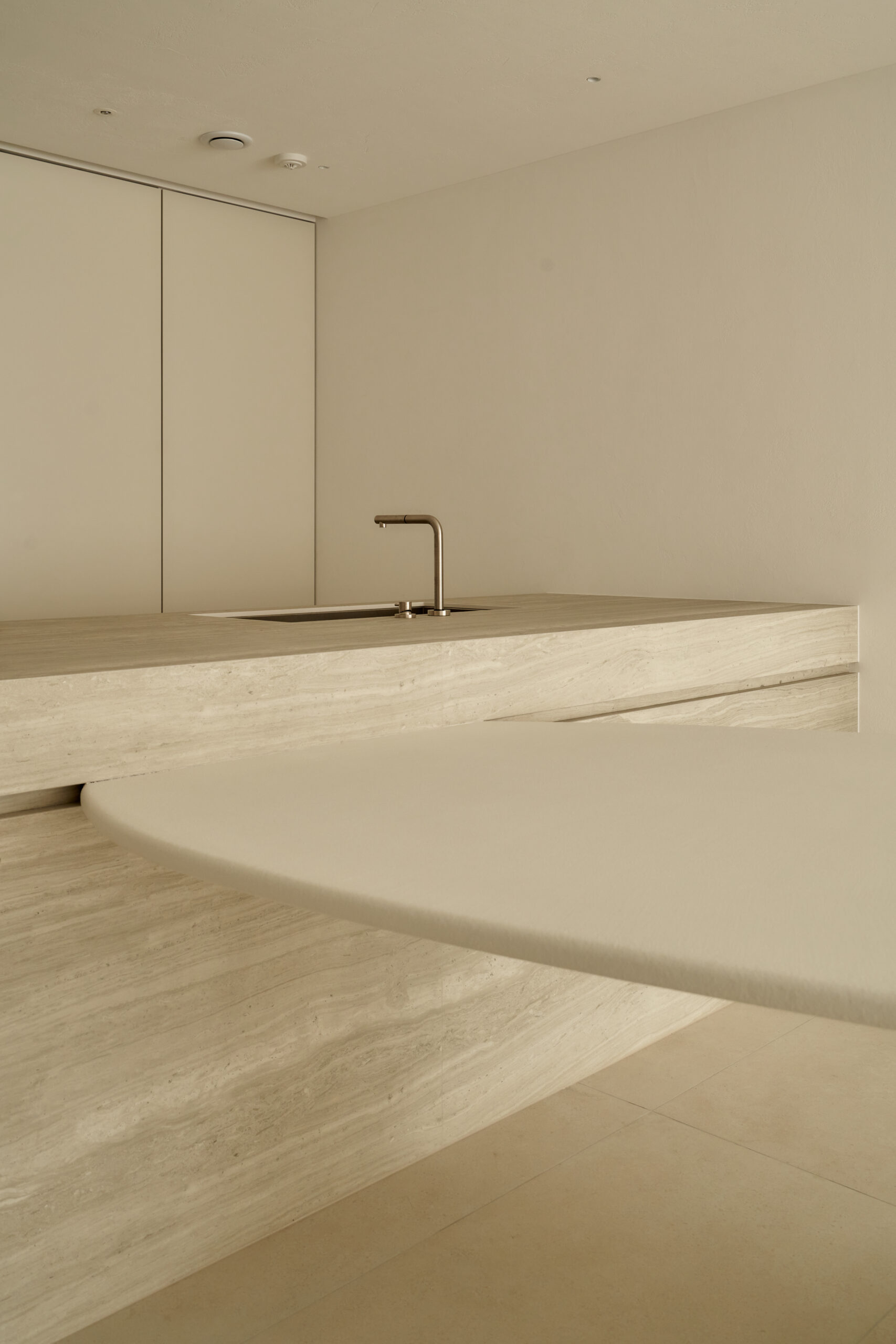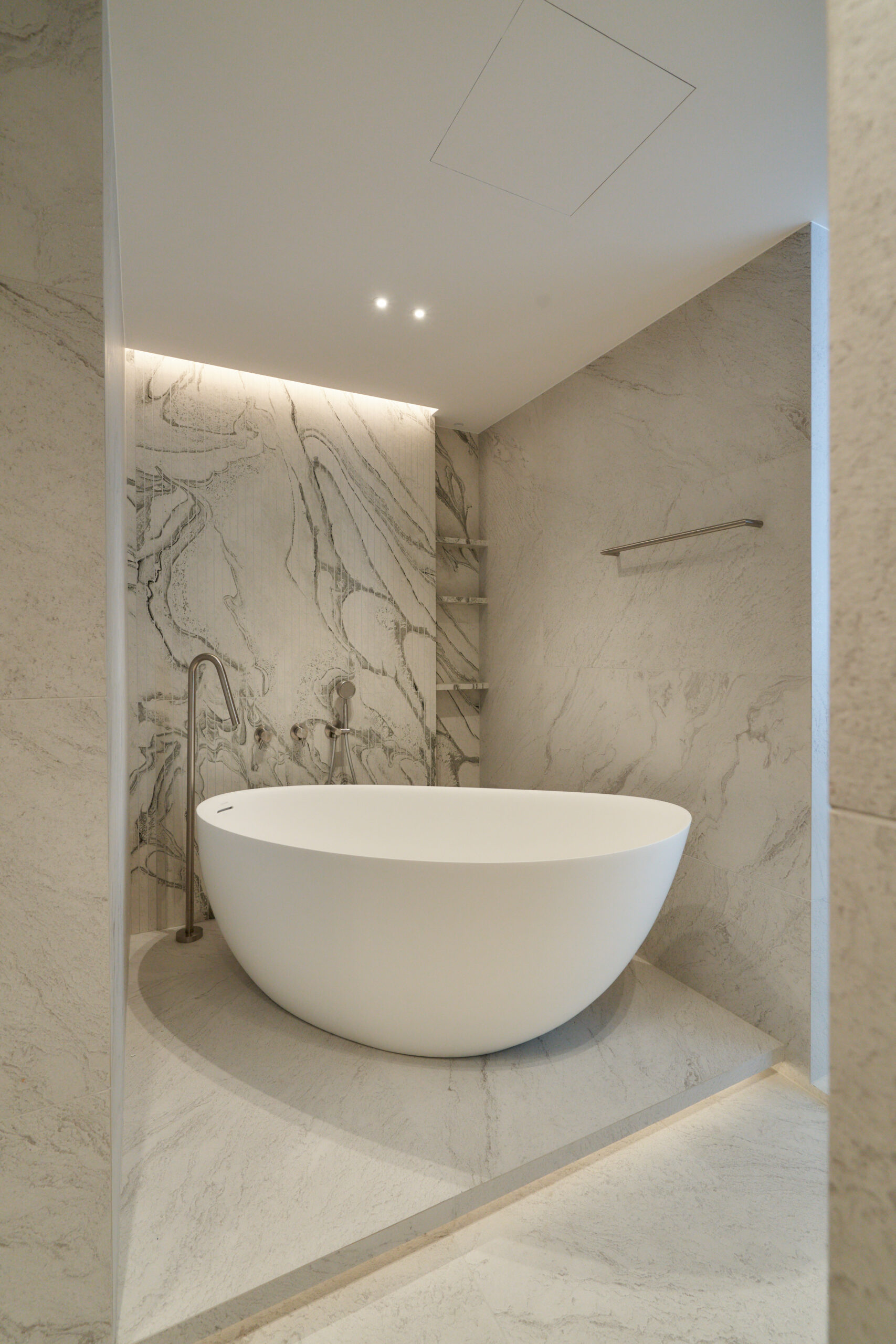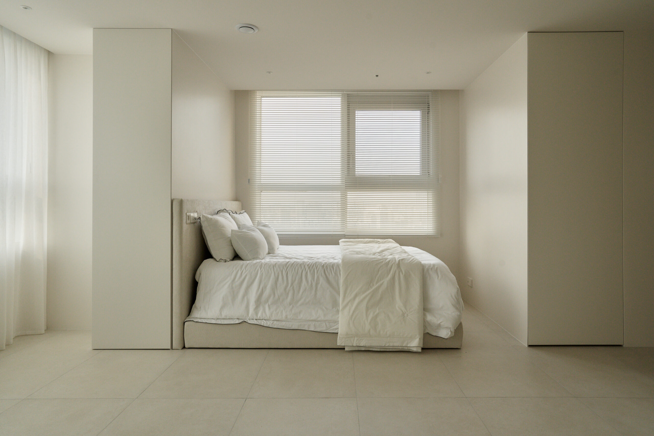 불필요한 요소는 과감히 덜어내고 수납과 기능에 충실한 디자인을 바탕으로, 타일 바닥을 적용해 시원하고 정제된 분위기를 연출했습니다. 주상복합 구조 특유의 제한적인 전용면적을 극복하기 위해 안방과 거실 사이에는 투명과 불투명 전환이 가능한 특수 글라스를 적용해 공간을 분리하거나 하나로 확장할 수 있는 가변성을 부여했으며, 절제된 구성 속에서 사용성과 공간 효율을 극대화하는 ‘미니멈 속의 맥시멈’을 구현했습니다.