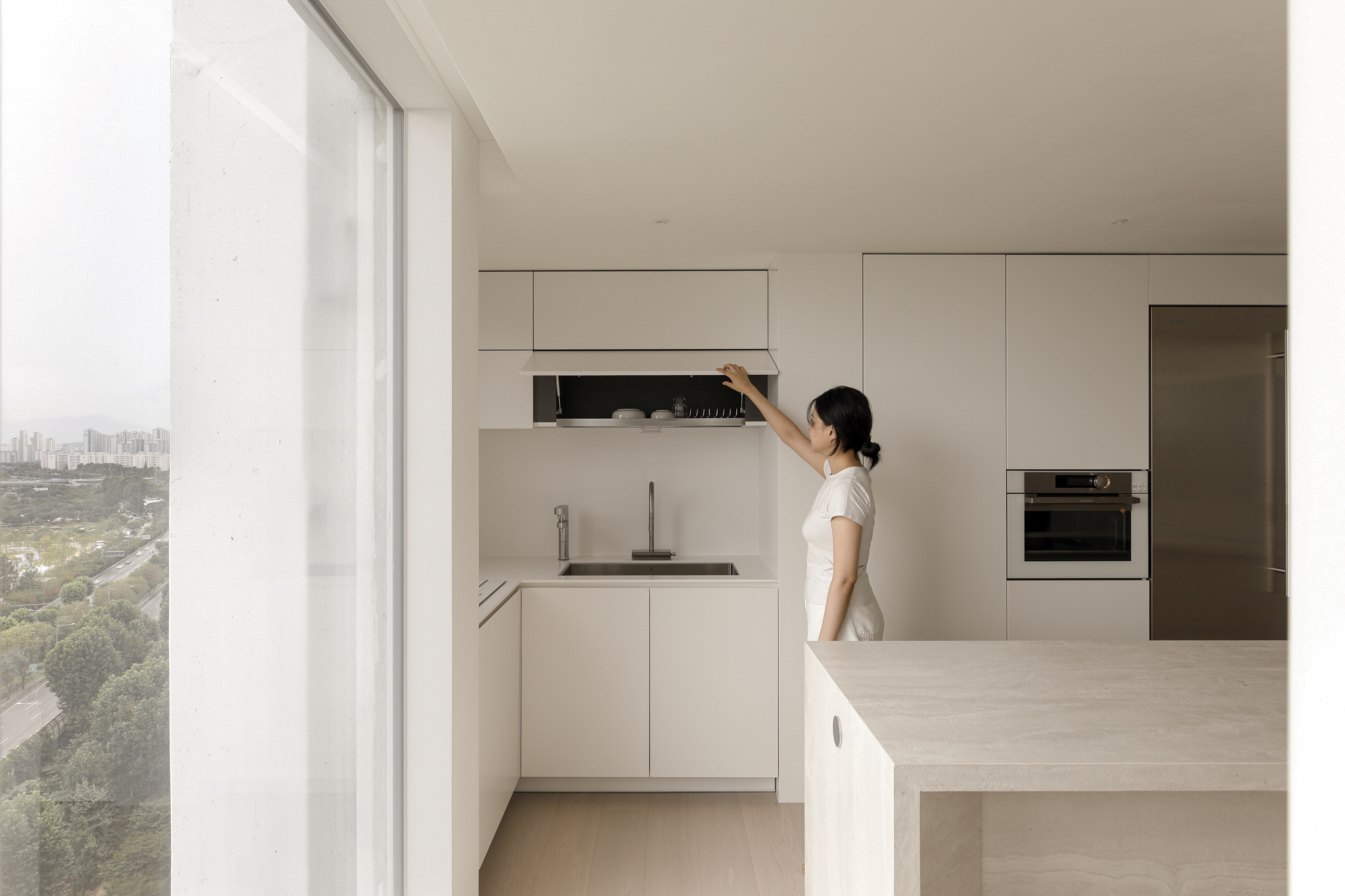 This project blends work and rest by reflecting the client’s lifestyle, opening key spaces to maximize the Han River view and create fluid transitions. Sculptural lime plaster surfaces, system windows, and carefully scaled curves shape a cohesive, light-responsive interior, while the living room’s recessed TV and fireplace form a calm, welcoming retreat.