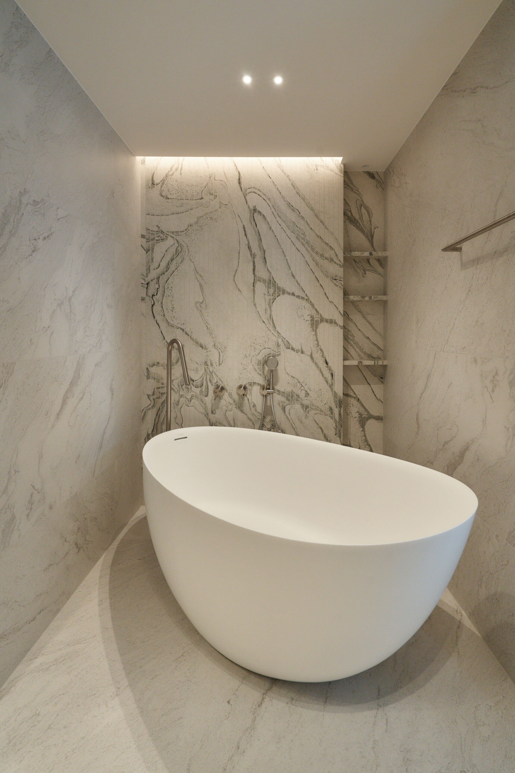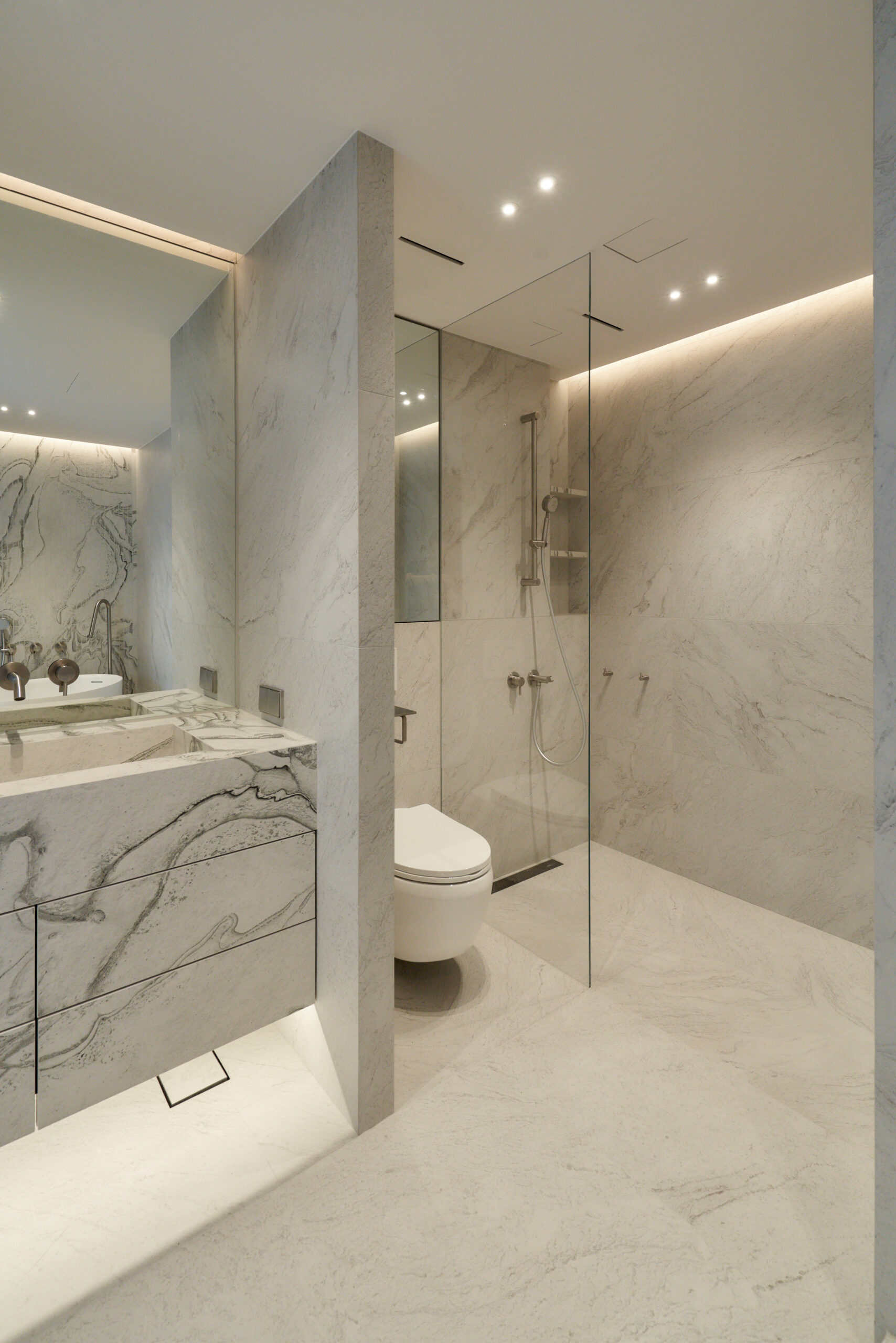 불필요한 요소는 과감히 덜어내고 수납과 기능에 충실한 디자인을 바탕으로, 타일 바닥을 적용해 시원하고 정제된 분위기를 연출했습니다. 주상복합 구조 특유의 제한적인 전용면적을 극복하기 위해 안방과 거실 사이에는 투명과 불투명 전환이 가능한 특수 글라스를 적용해 공간을 분리하거나 하나로 확장할 수 있는 가변성을 부여했으며, 절제된 구성 속에서 사용성과 공간 효율을 극대화하는 ‘미니멈 속의 맥시멈’을 구현했습니다.