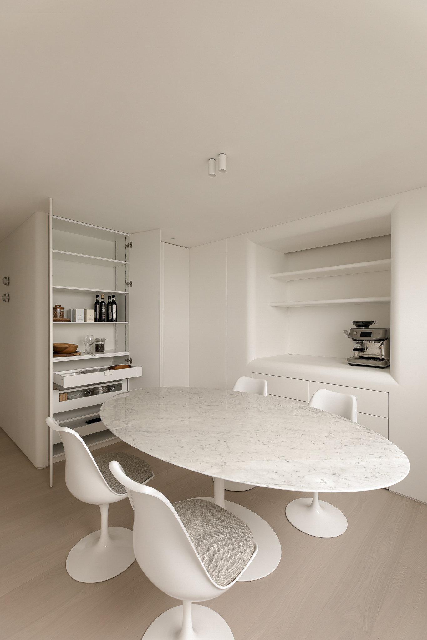 자연스럽게 흐르는 벽 속에 깊고 얕은 팬트리를 구성하고 벽과 수납 그리고 아파트에 기존에 있던